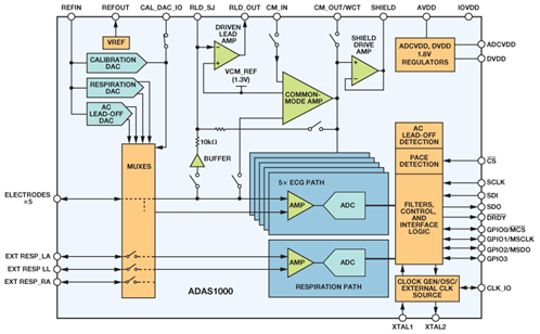 ADAS1000不但支持基本的心電圖信號(hào)監(jiān)控元件,還配有多種功能,比如前面提到過(guò)的呼吸測(cè)量(胸阻抗測(cè)量)、導(dǎo)聯(lián)線/電極連接狀態(tài)、內(nèi)部校準(zhǔn)、起搏偽像檢測(cè)功能等。一個(gè)ADAS1000支持5個(gè)電極輸入,為進(jìn)行傳統(tǒng)的6導(dǎo)聯(lián)心電圖測(cè)量提供了方便。通過(guò)另外級(jí)聯(lián)一個(gè)ADAS1000-2(輔助)器件,系統(tǒng)可以進(jìn)行真正的12導(dǎo)聯(lián)測(cè)量;通過(guò)級(jí)聯(lián)多個(gè)器件(3個(gè)及以上),系統(tǒng)可測(cè)量15條及以上的導(dǎo)聯(lián)線。
