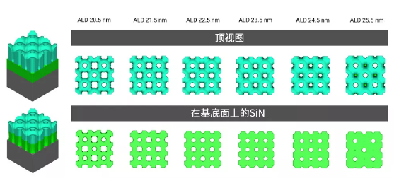 SEMulator3D中可以通過(guò)ALD厚度實(shí)驗(yàn)設(shè)計(jì)確定這一最佳厚度。該模擬的結(jié)果如圖5所示,刻蝕自上而下的形狀和底部橫截面也可見(jiàn)。隨著ALD厚度的增加,SiN /基底界面處的孔形狀從方形變?yōu)閳A形,并且逐漸變小。在足夠的ALD厚度下,菱形孔的尖端可視度有限,這會(huì)導(dǎo)致較低的刻蝕速率且刻蝕保持圓形。在23.5nm的ALD厚度下得到了此次剖面SiO2和SiN刻蝕工藝最均勻的孔形狀。