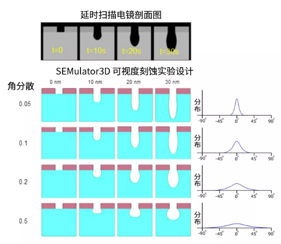 圖3:模擬實(shí)驗(yàn)設(shè)計(jì)與延時(shí)SEM的比較。模擬實(shí)驗(yàn)設(shè)計(jì)使用了恒定刻蝕量和不同的角分散(高斯分布的標(biāo)準(zhǔn)差),進(jìn)行模擬并顯示增量材料刪除步驟失效。右側(cè)的直方圖說(shuō)明了角度分布與軟件中數(shù)值設(shè)置的相關(guān)性(不按比例)。刻蝕工藝的實(shí)際角分散是通過(guò)找到與刻蝕輪廓最匹配的模擬實(shí)驗(yàn)設(shè)計(jì)結(jié)果來(lái)確定的。