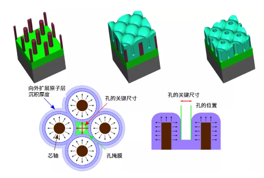 作為SEMulator3D中可視性刻蝕的示例,我們將使用剖面的二氧化硅 (SiO2)和氮化硅 (SiN) 刻蝕工藝模型來(lái)確定確保SADP柱孔關(guān)鍵尺寸的均勻性所需的最佳原子層沉積 (ALD) 厚度(見(jiàn)圖4)。該樣品由50nm SiN層和100nm高的碳芯軸組成,芯軸直徑20nm,水平間距80nm。最終目標(biāo)是使用SADP創(chuàng)建一個(gè)40nm間距的孔陣列。此剖面SiN / SiO2刻蝕的角分散為0.08,對(duì)所有異物的選擇比為0.3。使用ALD形成的孔不對(duì)稱形狀呈現(xiàn)為帶有圓形開(kāi)口的菱形,與在芯軸上形成的圓柱形孔形成對(duì)比。由于此菱形孔的大小可以通過(guò)ALD進(jìn)行調(diào)整,我們需要確定ALD的臨界厚度,刻蝕過(guò)程中這一厚度的ALD下進(jìn)入此菱形孔區(qū)域的離子總量與進(jìn)入圓柱區(qū)域的離子總量相等,這將帶來(lái)相等的刻蝕深度和形狀。