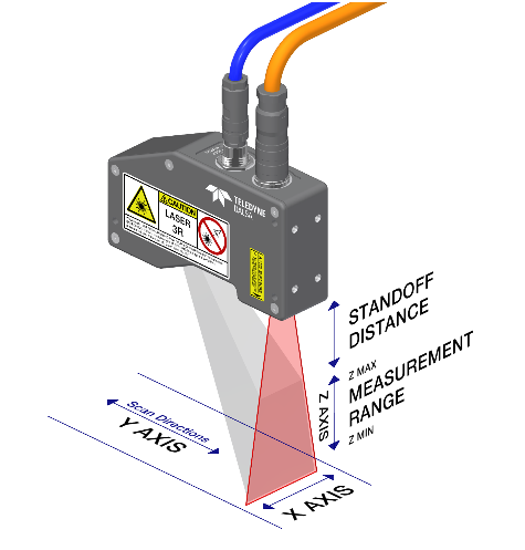 在典型的激光線輪廓儀中,激光線條被投射到物體上,并使用一個2D(區(qū)域/矩陣)圖像傳感器進行成像。在確定激光條紋在圖像傳感器上的位置后,輪廓儀會提供由激光條紋的光學(xué)三角測量產(chǎn)生的橫向(X軸)和深度(Z軸)信息。沿著激光線生成的XZ對集稱為輪廓。沿運動方向的兩個連續(xù)輪廓之間的距離構(gòu)成第三軸(Y)。通過這種方式掃描物體,我們獲得了物體的表面掃描信息(X,Y,Z)。