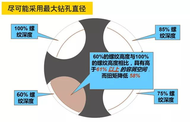 鉆頭鉆孔尺寸確定了螺紋底徑與螺紋高度的百分比,你使用的鉆頭直徑越大,達(dá)到的螺紋高度比越小。