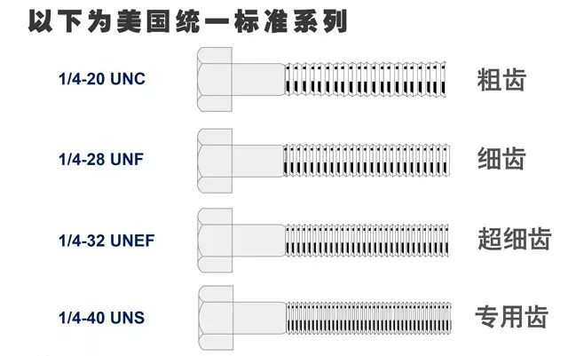 英制螺紋:英制螺紋是螺紋尺寸用英制標(biāo)注,是美國(guó)、英國(guó)與加拿大根據(jù)統(tǒng)一的體系開(kāi)發(fā)的。