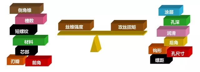 (4)絲錐設(shè)計(jì)需考慮的因素:絲錐槽型、刀具材料、表面強(qiáng)化處理。這些設(shè)計(jì)特點(diǎn)必須保持平衡,才能提供適當(dāng)?shù)那邢鳎行伎刂?,?rùn)滑和扭轉(zhuǎn)強(qiáng)度。